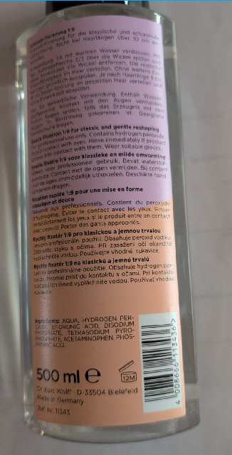 Schnellfixierung im 500 ml Fixierapplikator mischen. 1 Teil Schnellfixierung (50 ml) und 9 Teile warmes Wasser (450 ml) gut vermischen. 2/3 über die Wickel spülen und ohne Einwirkzeit alle Wickel entfernen. Die restliche Fixierflüssigkeit im Haar verteilen. Ohne weitere Einwirkzeit gründlich ausspülen.