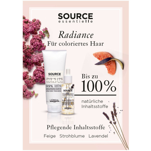 Haar-Creme für coloriertes Haar, Farbbrillanz, Farbreflexe, Feuchtigkeit,nährend, pflegend Der Source Essentielle Radiance Balm ist eine Farbglanz-Maske für gesträhntes, blondiertes oder coloriertes Haar. Vegane Formel mit Duft- und Farbstoffen natürlichen Ursprungs. Keine Inhaltsstoffe und keine Nebenprodukte tierischer Herkunft. Das Radiance Balm bietet eine sofortige, intensive Farbpflege basierend auf einer natürlichen Zusammensetzung der Inhaltsstoffe, damit gesträhntes, blondiertes oder coloriertes Haar in neuem Glanz erstrahlt. 99% der Inhaltsstoffe sind natürlichen Ursprungs. Zum Ausspülen. Auf handtuchtrockenem Haar anwenden. Bei Kontakt mit den Augen diese sofort ausspülen. Pflegelinien für jedes Haarbedürfnis!